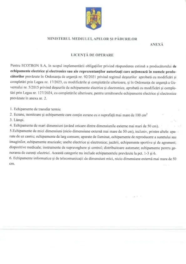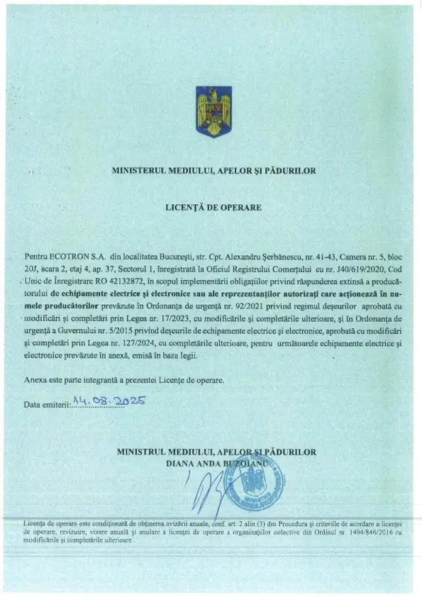 Ecotron SA este o organizație colectivă autorizată din anul 2021 si deține Licența de operare din data de 14.08.2025, emisă de Ministerul Mediului, Apelor și Pădurilor. Această licență atestă faptul că activăm legal și responsabil în domeniul preluării obligațiilor producătorilor de echipamente electrice și electronice și gestionăm în mod profesionist întregul flux de colectare, tratare și reciclare a DEEE.